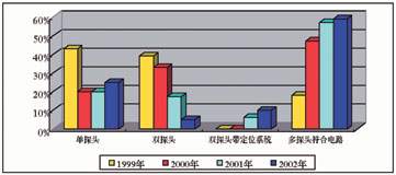 圖1 所示從1999年到2002年(2002年的數(shù)據(jù)是由上半年數(shù)據(jù)推算而來)單探頭、雙探頭、雙探頭帶定位系統(tǒng)和多探頭符合線路,四種不同核醫(yī)學(xué)設(shè)備每年各種類型所占比例。可以看出。最為明顯的是普通雙探頭在2002年僅僅占總數(shù)的5%,普通單探頭占總數(shù)25%,多探頭帶符合電路系統(tǒng)占總數(shù)59%。普通雙探頭帶X線定位系統(tǒng)占總數(shù)10%?梢钥闯鰡翁筋^SPECT和多探頭符合電路系統(tǒng)呈增長趨勢,尤其以多探頭符合電路系統(tǒng)更為明顯。