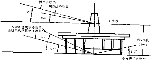 5.7.1 以天線為中心,半徑200 m以內(nèi)不得有建筑物(機房除外);半徑200 m以外,金屬結(jié)構(gòu)建筑物的高度不應(yīng)超過以天線基礎(chǔ)為準(zhǔn)1.2o垂直張角,木質(zhì)結(jié)構(gòu)建筑物的高度不應(yīng)超過以天線基礎(chǔ)為準(zhǔn)2.5o垂直張角。
